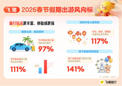 春节假期也是阖家团圆、带娃旅行的热门时段。飞猪数据显示,截至目前春节假期亲子家庭的出游需求同比大增,包括上海迪士尼度假区、北京环球度假区、上海乐高乐园度假区、长隆度假区、方特旅游度假区等在内的热门主题乐园门票预订量同比增长141%。亲子家庭对旅行品质和体验的追求也更高,飞猪数据显示,截至目前亲子家庭的人均预订金额同比提升12个百分点。